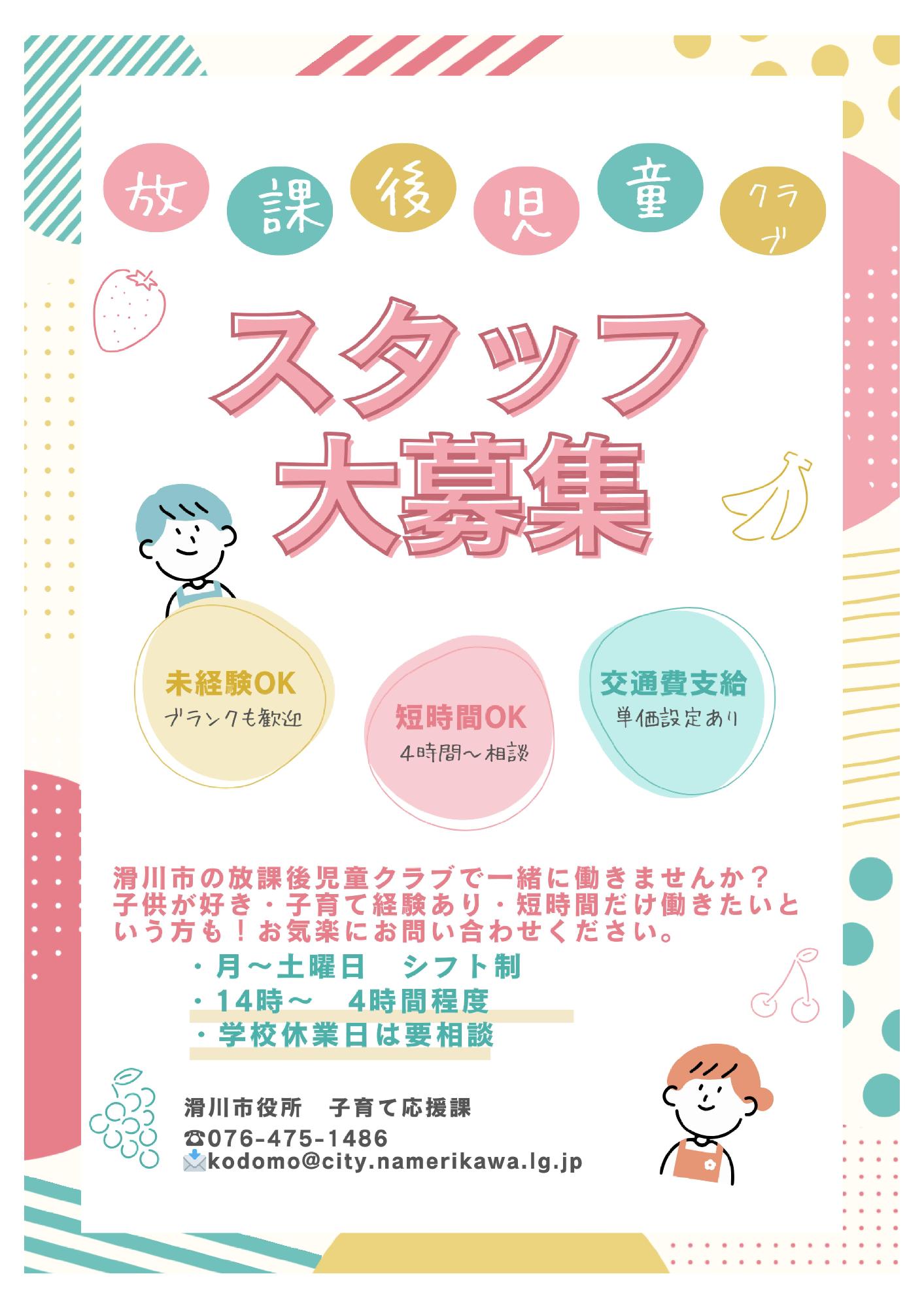 滑川市では放課後児童クラブ(学童保育)で、放課後などに小学生の遊びや生活の指導をしていただける方を募集(登録)しています。