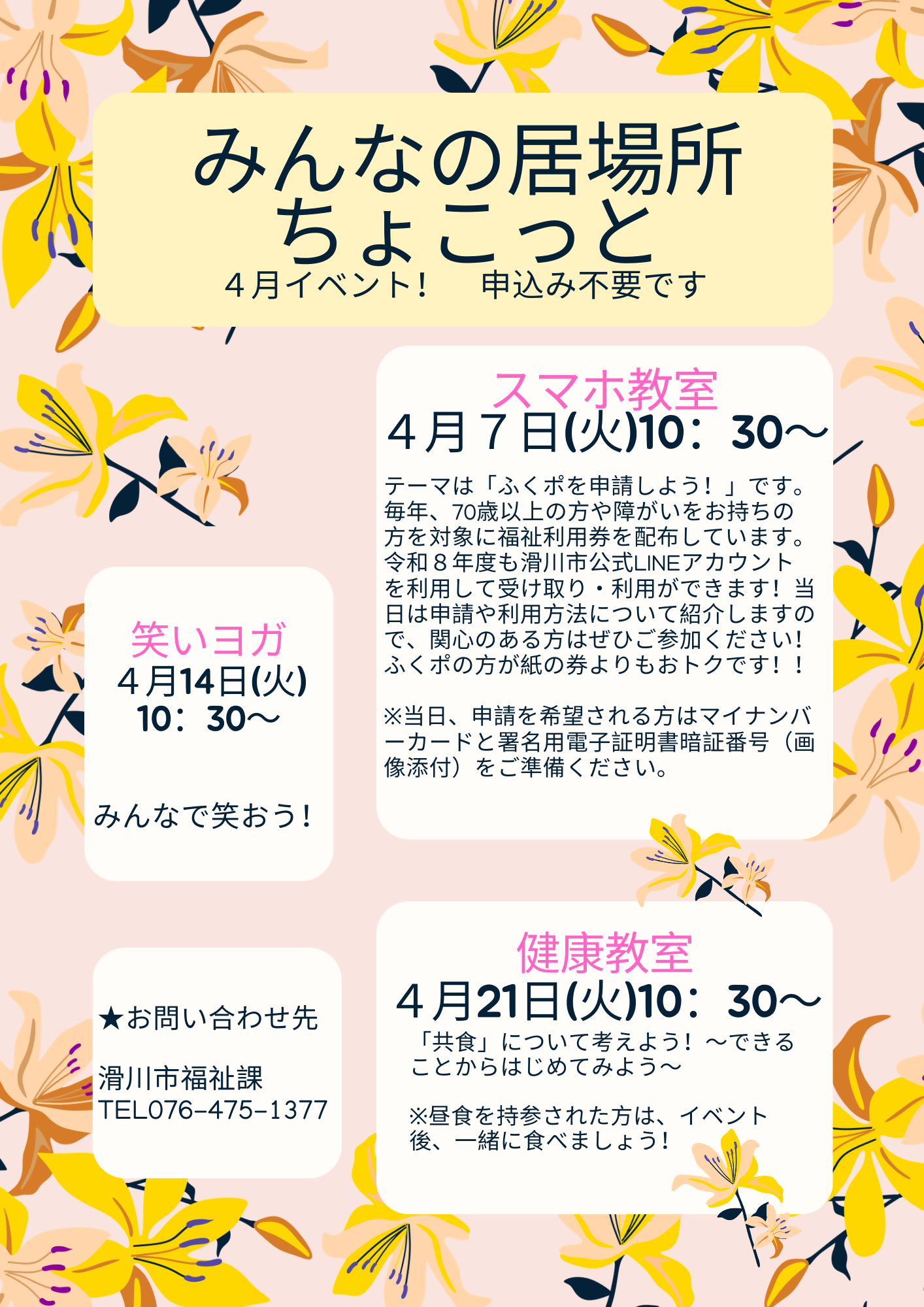 テーマは「ふくポを申請しよう!」です。毎年、70歳以上の方や障がいをお持ちの方を対象に福祉利用券を配布しています。令和8年度も滑川市公式LINEアカウントを利用して受け取り・利用ができます!当日は申請や利用方法について紹介しますので、関心のある方はぜひご参加ください!ふくポの方が紙の券よりもおトクです!!