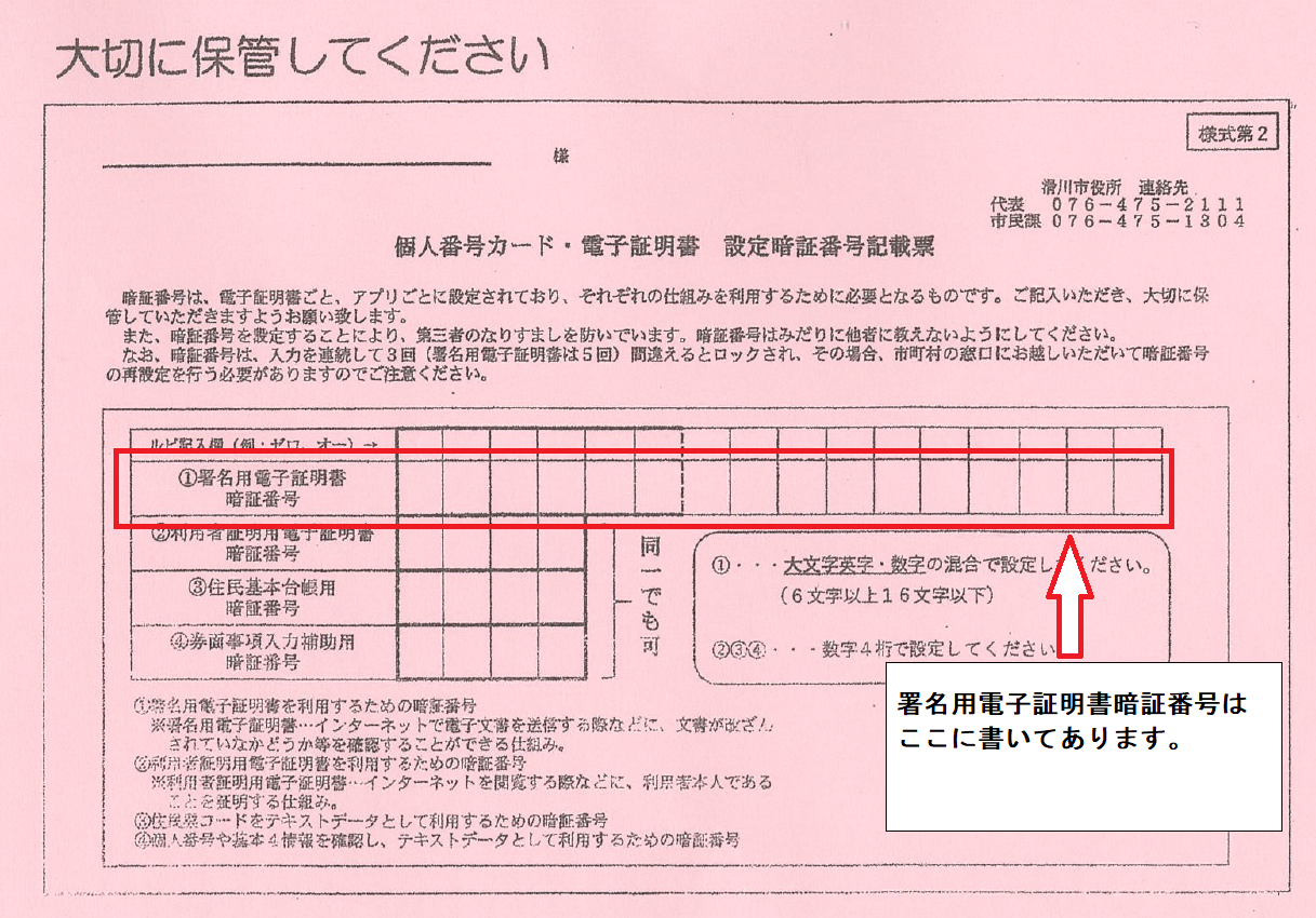 ※当日、申請を希望される方はマイナンバーカードと署名用電子証明書暗証番号(画像添付)をご準備ください。