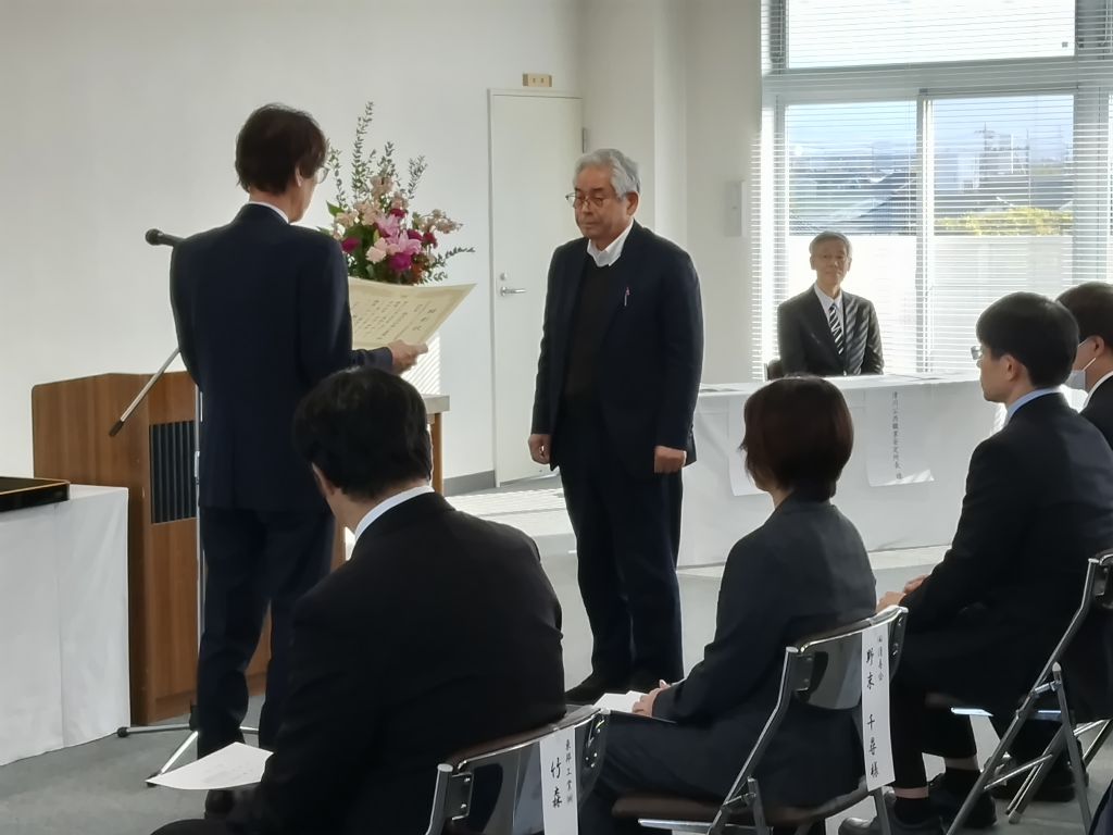 水野市長から顕彰状を受け取る 北陸電機製造株式会社 山下 敏範 総務課長