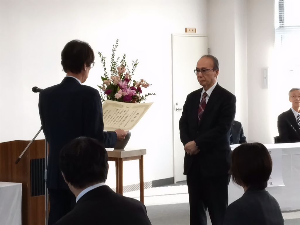 水野市長から顕彰状を受け取る 三晶技研株式会社 法嶋 正夫 代表取締役社長