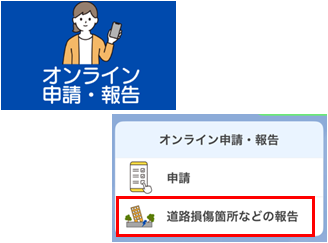 1.LINEのメニューから「オンライン申請・報告」をタップし、「道路損傷箇所などの報告」を選択してください。