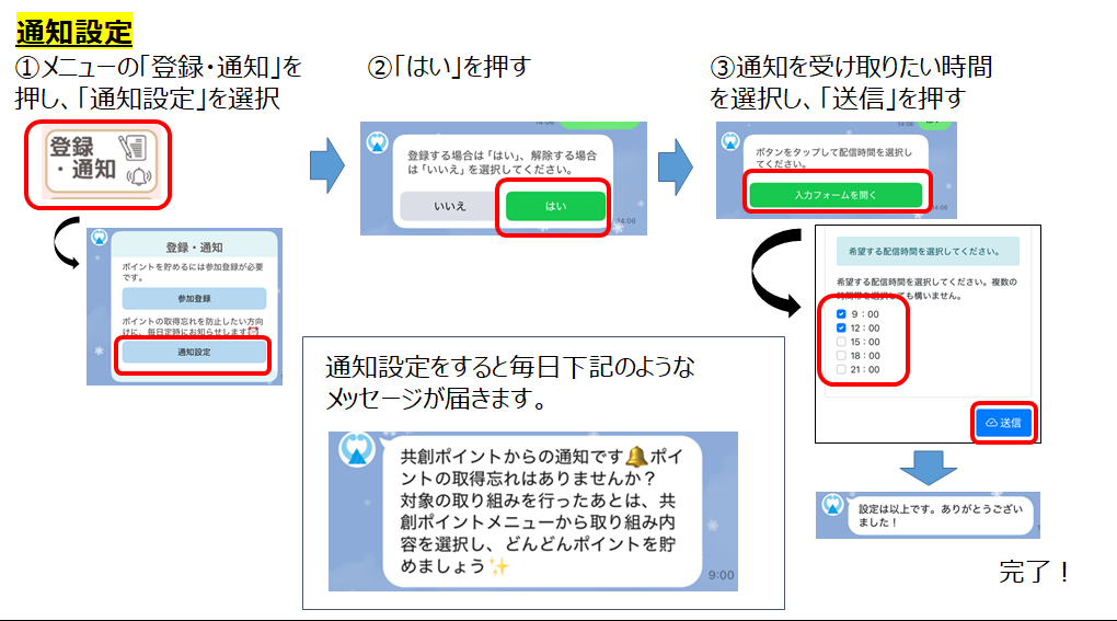 毎日決まった時間に「ポイントは取得しましたか?」という通知を受け取ることができます。「取り組んだのにポイントの取得を忘れてしまう」という方はぜひご活用ください。